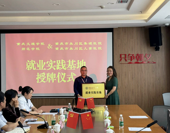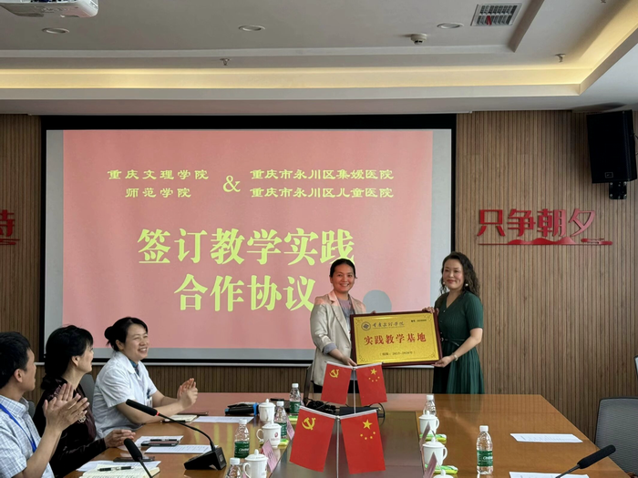 樊勇围绕医院概况、发展历程、设备资源、人才需求等情况进行讲解。隋剑飞介绍了师范学院的学科专业发展、人才培养、学生实践、2024届毕业生就业需求等情况;接着,双方签订《伟德国际1946 重庆市永川区儿童医院共建教师教育共同体战略合作框架协议》。最后,双方就建立实践教学基地、就业实践基地达成共识,隋剑飞代表学院现场授牌。