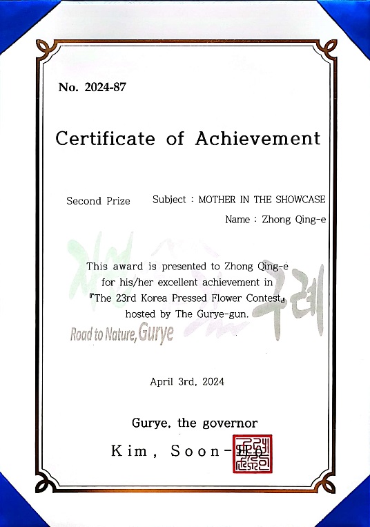 近日,第23届韩国国际压花比赛颁奖典礼在韩国邱礼举行,我校师生作品再获殊荣。由廖静老师指导的2021级园林专业钟青娥作品“橱窗里的母亲”获二等奖,2021级园林专业赵江霞同学与周凡力老师合作作品“最后的拥抱”获艺术奖。
